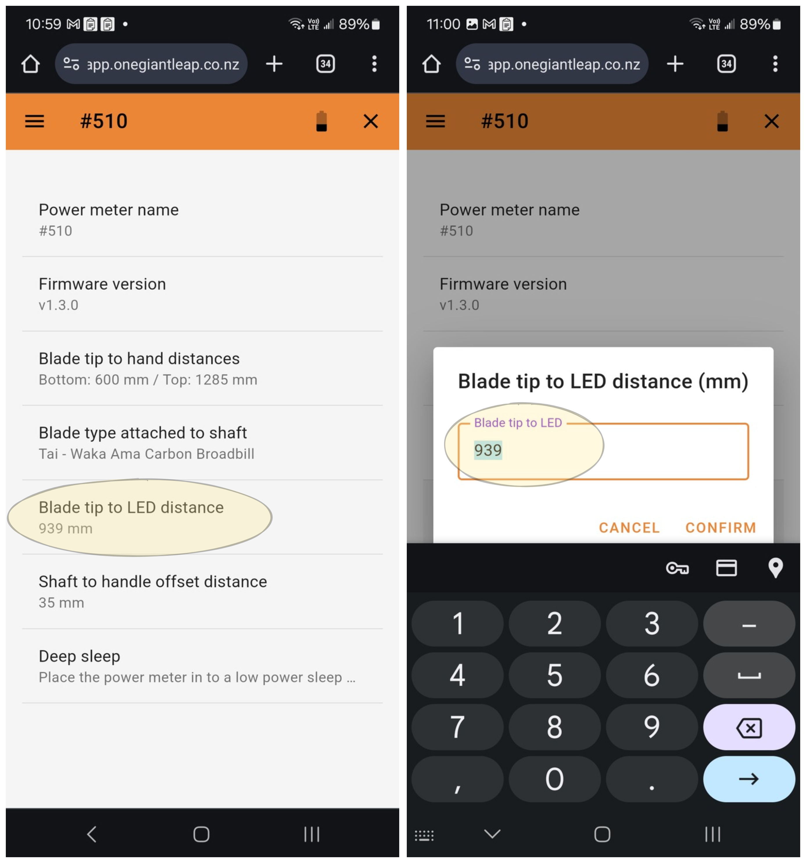 Click on *'Blade tip to LED distance'* in the [Web Bluetooth App](https://app.onegiantleap.co.nz) and enter the distance measured in Step 1. above.